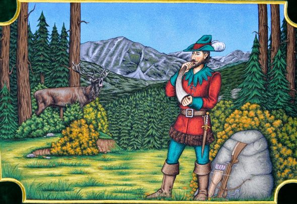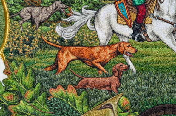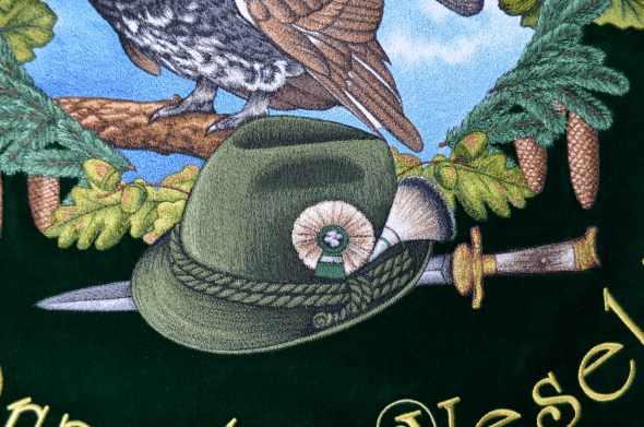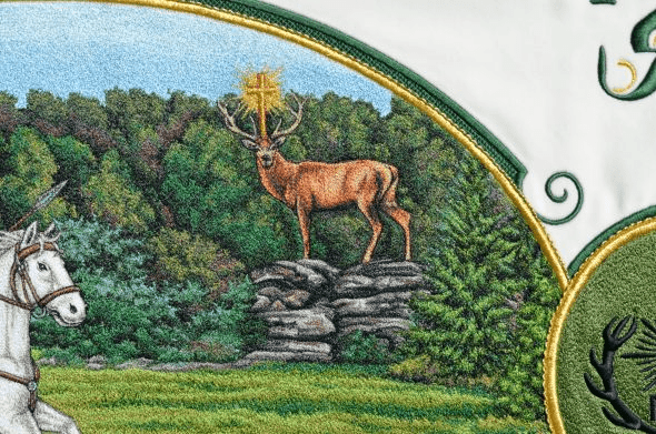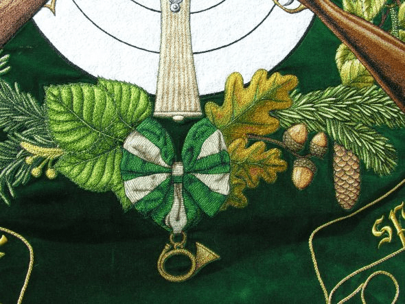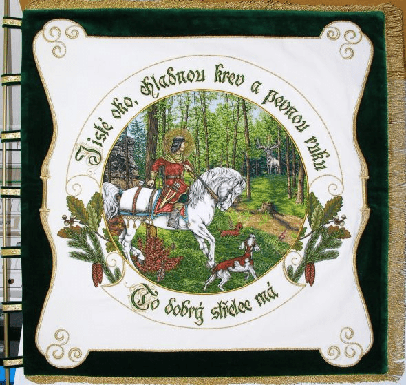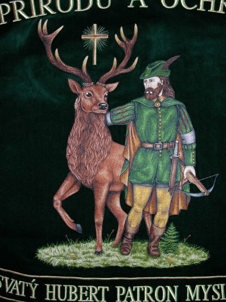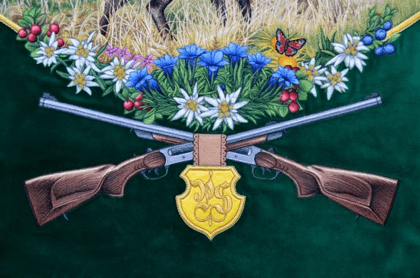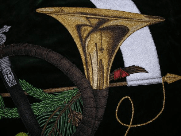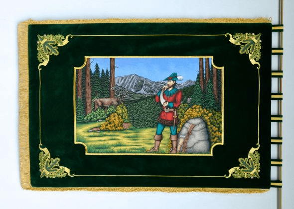 Bogato haftowane myśliwski Sztandar, podnieść tradycję polowania. Kluby łowieckie i Rycerze św Hubert ma haftowane polowanie bandery lub Sztandar polowania we wnętrzu. Łowieckie sztandary wykonane są z wysokiej jakości aksamitu lub rozrywa flagi z jedwabiu.