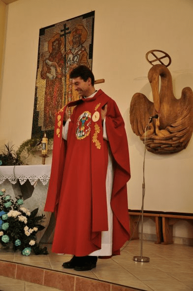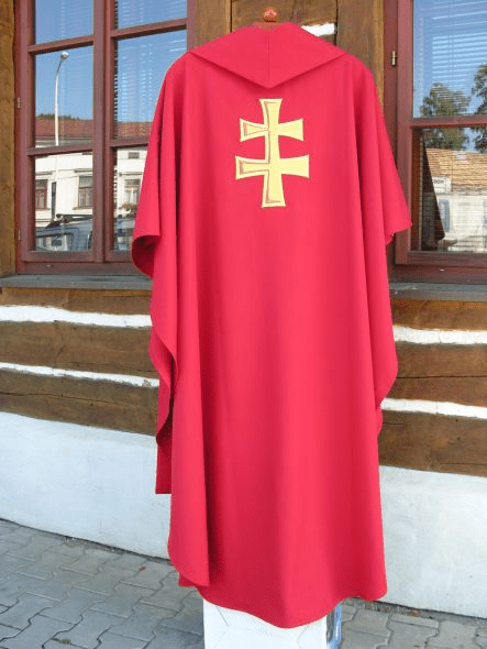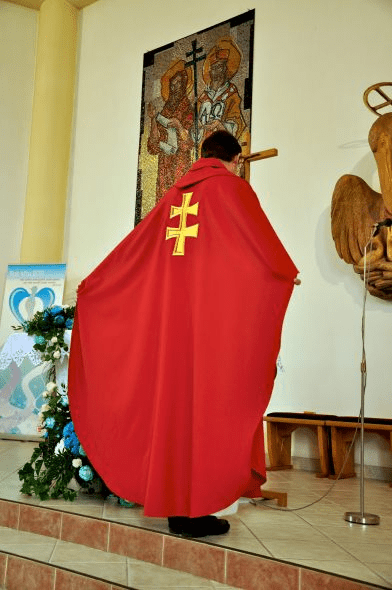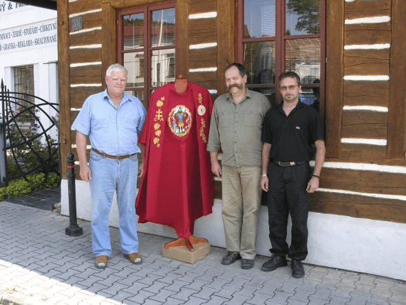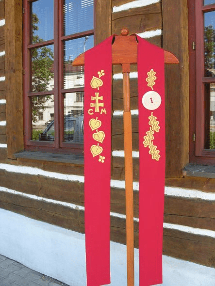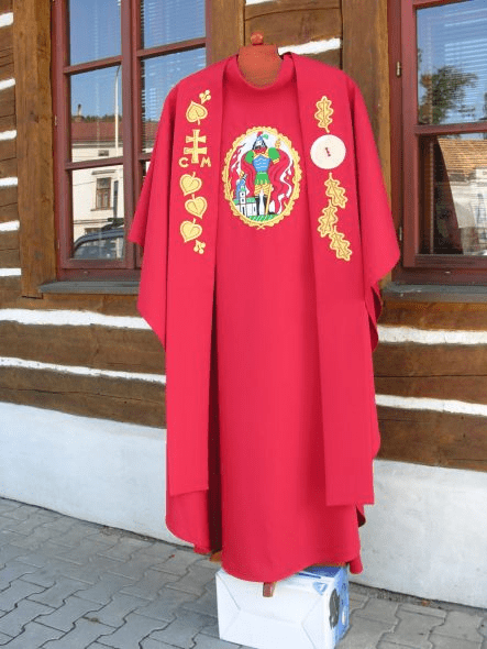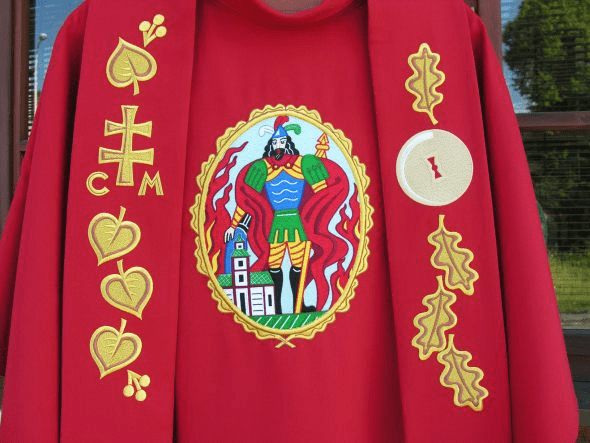 Obec Kladeruby nám svěřila výrobu vyšívané i tištěné obecní vlajky a žerdě. Další část zakázky bylo vytvořit návrh a realizovat vyšívaný ornát pro pana faráře. Ornát musel stylově ladil k obecním symbolům a novodobému kostelu. Pro obec Kladeruby to nebyla naše první zakázka již v roce 2001 se tam vyšíval prapor pro dobrovolný hasičský sbor.